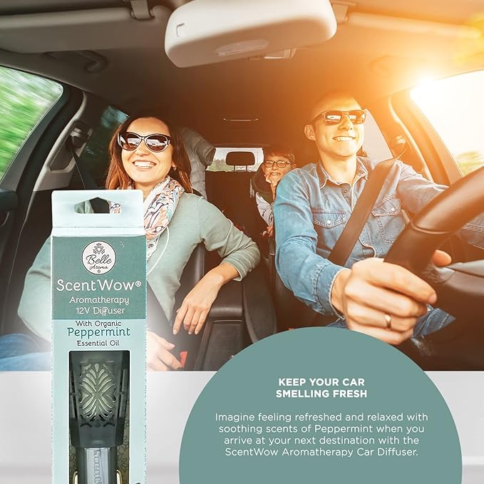 Belle Aroma ScentWow Aromatherapy - Peppermint Oil Car Diffuser for Essential Oils – Portable 12V Plug-In Mini Diffuser – Compact Travel Humidifier for Cars, Trucks & Small Spaces – Gray & Silver