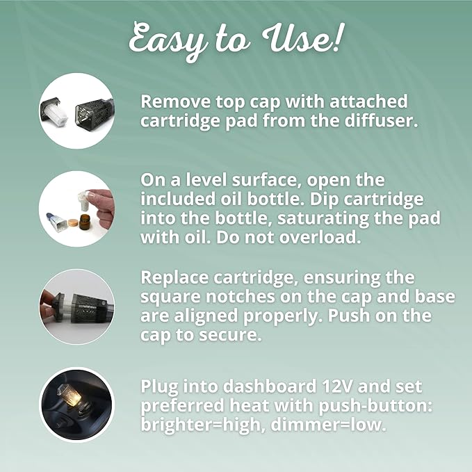 - EASY TO USE: Simply remove the top cap with the attached cartridge pad from the diffuser and dip it into the oil bottle, saturating the pad with oil but soaking it in fast. Replace the cartridge and ensure the square notches on the top cap and base are correctly aligned. Push on the cap to secure, and you are ready to plug the diffuser into the dashboard 12V and set it according to your preferred heat and scent.