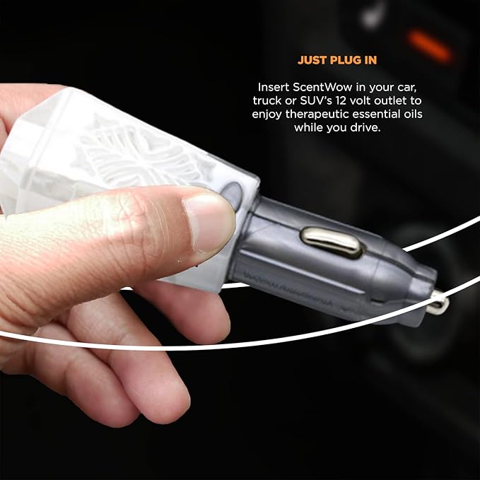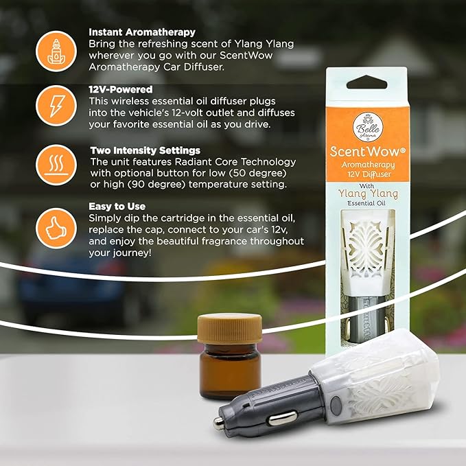 Belle Aroma ScentWow Aromatherapy - Ylang Ylang Car Diffuser for Essential Oils – Portable 12V Plug-In Mini Diffuser – Compact Travel Humidifier for Car, Truck & Small Spaces – White & Gray