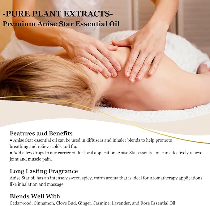 - Scent Characteristic: Anise star essential oil has an intensely sweet, spicy, warm aroma that is sometimes described as licorice-like. Pure plant extracts which not add any additives, fillers.