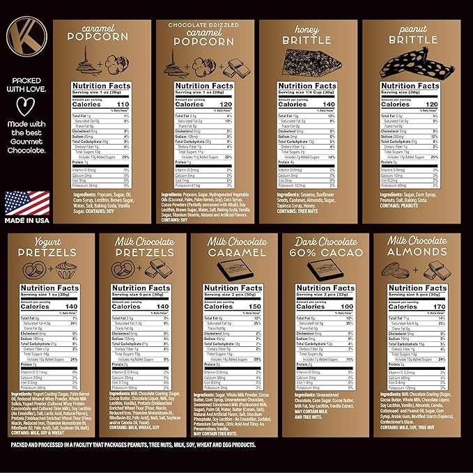 - HANDPICKED SELECTION OF 9 TYPES OF TREATS: A carefully curated selection of sweet delicacies nestled within the basket: Chocolate Drizzle Caramel Popcorn, Caramel Popcorn, Yogurt Pretzels, Chocolate Covered Pretzels, Chocolate Covered Cashews, Peanut Brittle, Honey Crunch, Ghirardelli Intense Dark Chocolate & Milk Chocolate Squares.