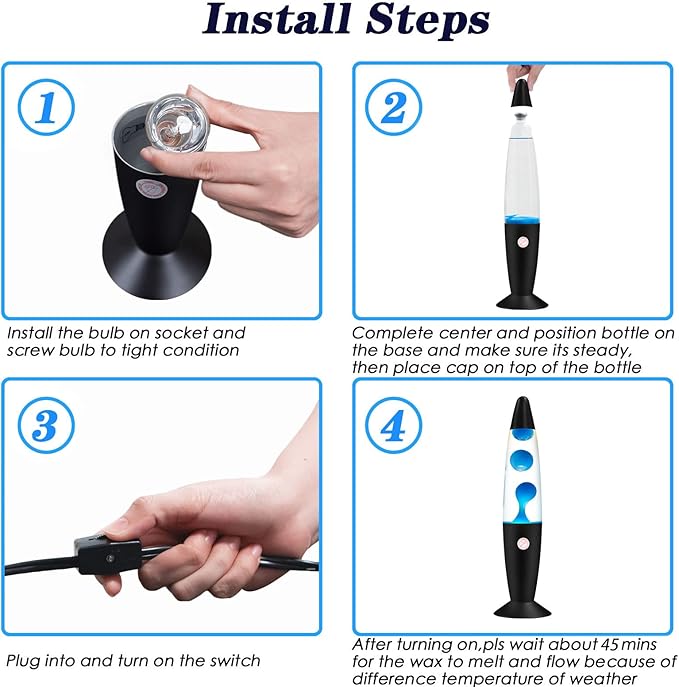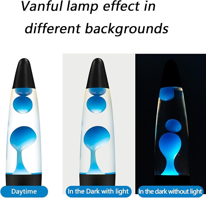 - 【Suitable Present】:13 inches glitter lamp comes with black aluminum bottom and cap, it is more fashion and light. Beautiful blue wax motion with the warm light make it a pleasantly surprised present for family and friends. Nice addition for home, office, bedroom.