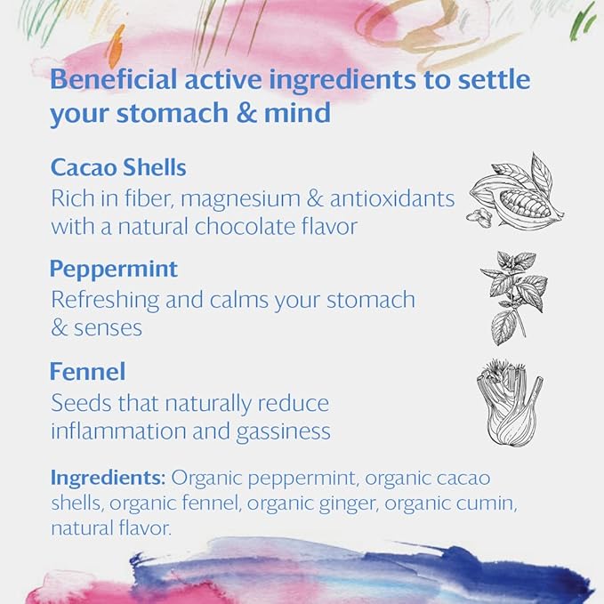 - PACKED WITH FLAVOR AND BENEFITS. Antioxidant rich cacao shells are filled with magnesium, iron, zinc, and fiber. Ginger and fennel are natural digestives that gently calm your body from the inside out.