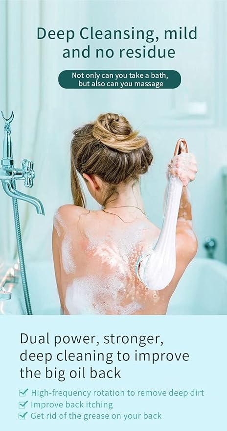 - 【IPX6 Waterproof & Rechargeable】Our electric back brush with IPX6 waterproof rating, which is the perfect shower buddy, can be used for showering and bathing with confidence. Built-in 800mAh large battery can continuously work for 60 minutes, no need to worry about sudden interruption. USB charging port is hidden in the end of the handle, just turn left to open the waterproof cover to charge, providing you with a wireless and hassle-free experience.