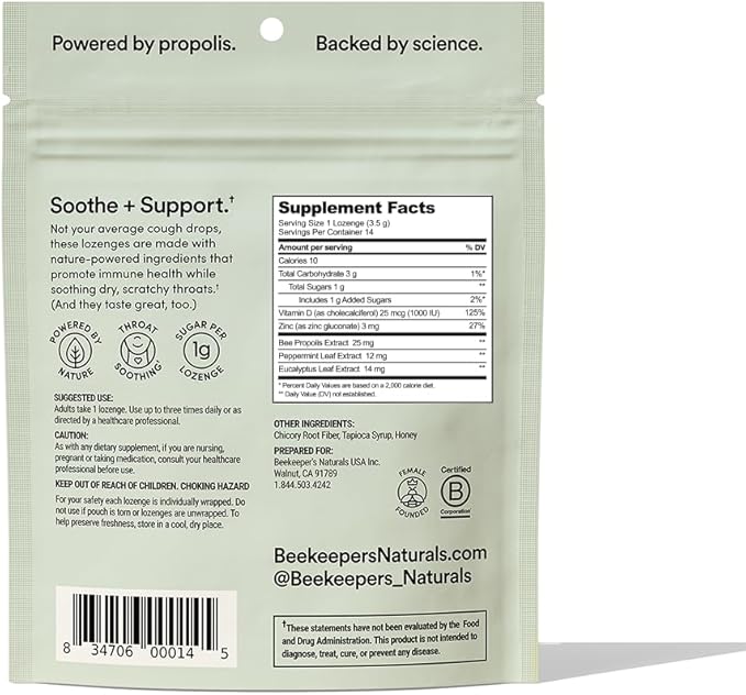 - NATURAL COUGH DROPS: Not your average cough drops, these propolis lozenges are made with powerful ingredients: Raw honey, propolis, eucalyptus, peppermint, Vitamin D and zinc, that promote immune health while soothing dry, scratchy throats. (And they taste great, too.)
