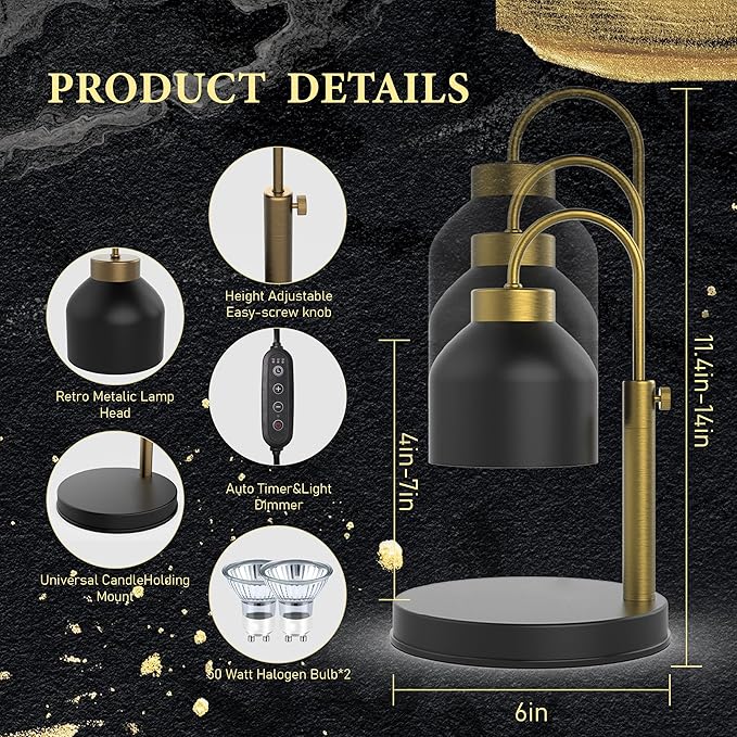Candle Warmer Lamp, 2 Bulbs, Timer & Dimmer, Height Adjustable, Compatible with Large Yankee Candle Jars, 3 Wick Candles, 110-120v, Black