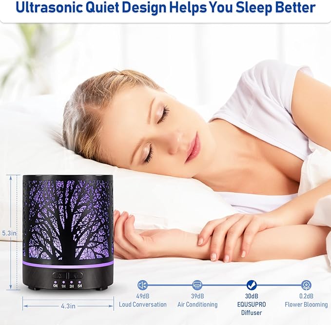 - Classic Tree Design: EQUSUPRO metal essential oil diffuser designed with classic tree pattern, a stylish decor to contemporary home, office, gym, spa or studio. The metal cover of diffuser can be easily removed, filled in water and 6-9 drops essential oil, helping you benefit from aromatherapy.