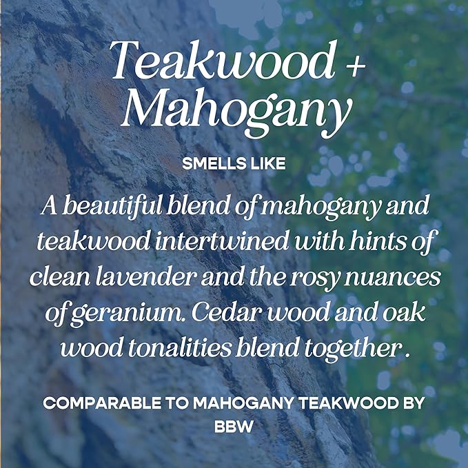 - OUR SCENT: Teakwood + Mahogany - A beautiful blend of mahogany and teakwood intertwined with hints of clean lavender and the rosy nuances of geranium. Cedar wood and oak wood tonalities blend together to enhance and complete this fragrant blend!