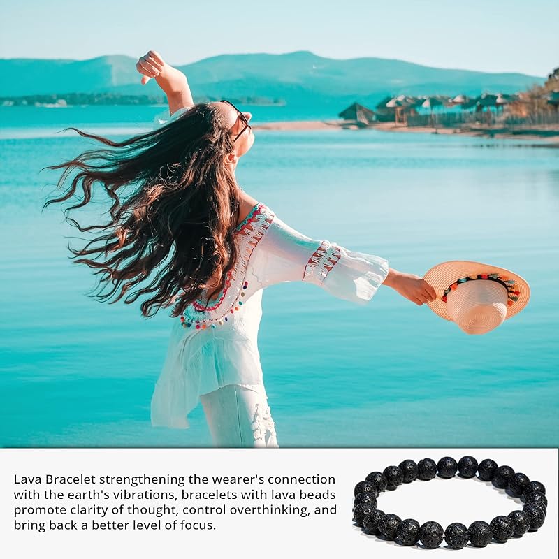 Lava Rock Diffuser Bracelet, Natural Healing Crystal Bracelet for Women and Men, 8mm Round Beaded Bracelet for Spiritual, Protection, Positive Energy, Elastic Adjustable Size Gemstone Bead Bracelet