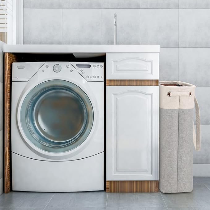 i BKGOO Laundry Basket with Handles Beige&Silver Slim Laundry Bin Collapsible Dirty Clothes Basket Narrow Laundry Bag Foldable Dirty Hamper for Camping, Dorms, Apartments