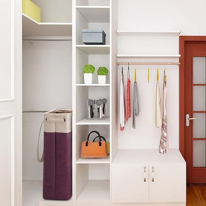 i BKGOO Laundry Basket with Handles Beige&Burgundy Slim Laundry Bin Collapsible Dirty Clothes Basket Narrow Laundry Bag Foldable Dirty Hamper for Camping, Dorms, Apartments