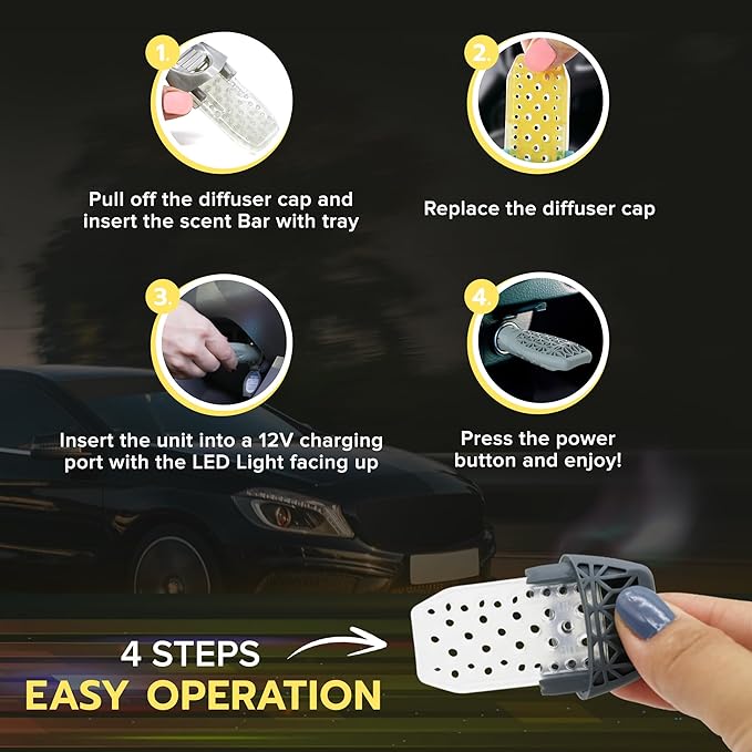 - EASY-TO-USE, REFILLABLE DESIGN FOR HASSLE-FREE FRESHNESS: Enjoy mess-free fragrance with this car air freshener refillable system. Simply insert a scent bar, plug into your vehicle's 12V outlet, and enjoy continuous freshness with auto shut-off. No liquids or gels, just clean, convenient aroma whenever you need it.