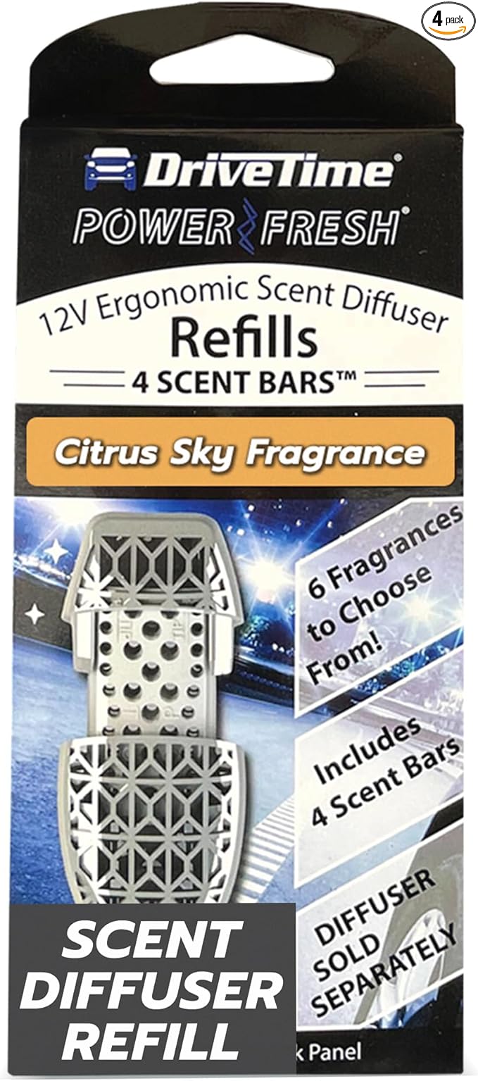 - FRESHEN YOUR DRIVE WITH 4 CITRUS SKY SCENT BARS: Elevate your driving experience with the fresh car scent of Citrus Sky. Each refillable car air freshener bar delivers long-lasting fragrance, lasting for weeks based on your preferred intensity. Try other captivating aromas like Amber Vanilla, Exotic Teak, Speedway, Evergreen Forest, and Cinnamon Blast.