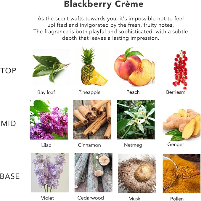 - Scent including: Berriesm,Blackberry,Bay leaf,Lilac,Cinnamon,Vielot,Cedarwood,Musk.etc