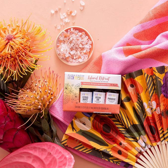 - ISLAND RETREAT - Transform your space into a lush, vibrant oasis with Aura Cacia's Island Retreat Essential Oil Kit. Featuring 3 pure blends, Paradise, Citrus Burst, and Ocean Air. Pleasantly light and never overpowering.