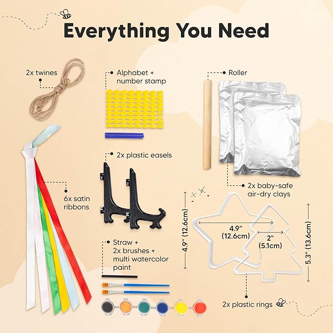 - All-Inclusive Kit - Our Trove Baby Handprint Ornament Kit for babies offer 2 baby-safe airdry clay, 2 shaped rings, acrylic paints, 2 paint brushes, 6 satin ribbons, 2 twig strings and alphabet stamps. DIY personalized newborn gifts for your babies!