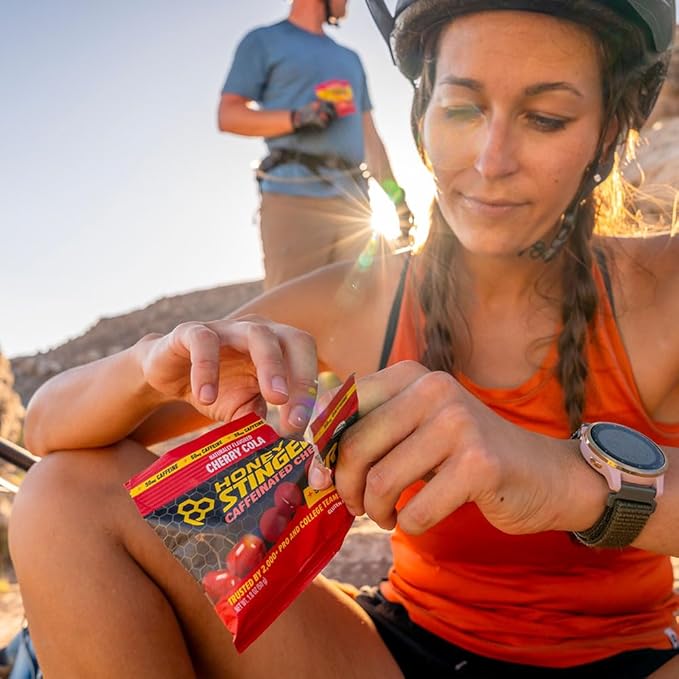 - DELICIOUS Naturally loaded with organic fruit flavors, Honey Stinger Caffeinated Energy Chews are bite-sized soft chews made using honey that won’t get stuck in your teeth and help to deliver quick, sustained energy on-the-go.