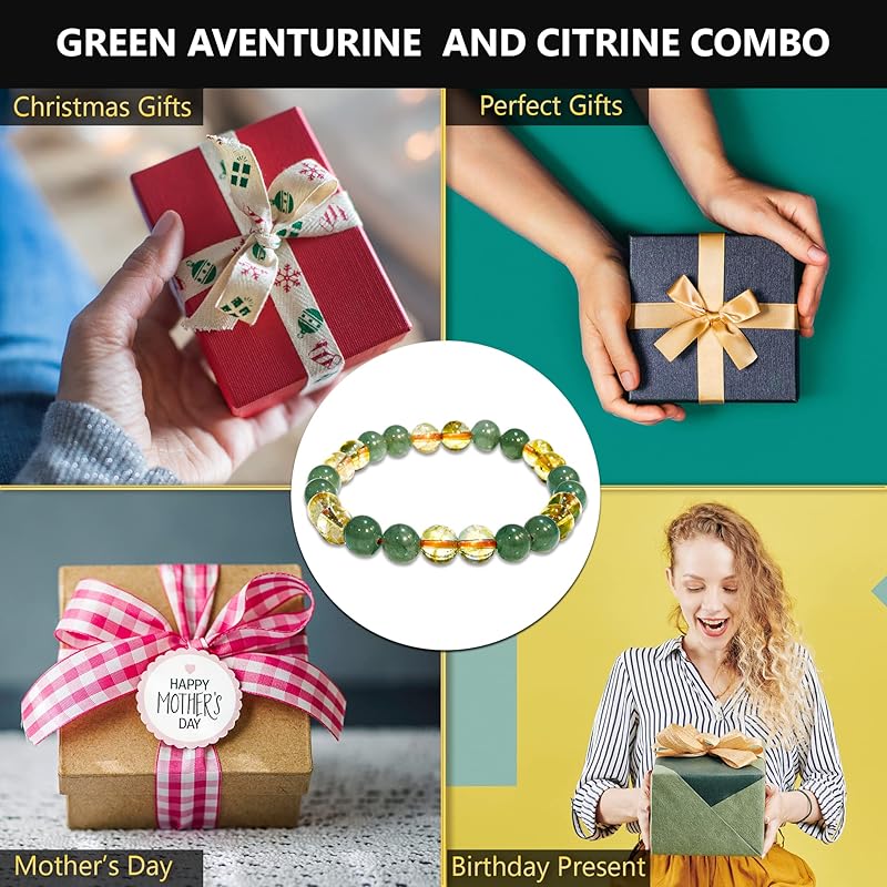 Citrine, Green Aventurine Bracelet – Healing Crystal Bracelet for Women and Men – 8mm Round Beaded Bracelet for Good Luck, Wealth, Abundance – Elastic Adjustable Size Gemstone Bead Bracelet