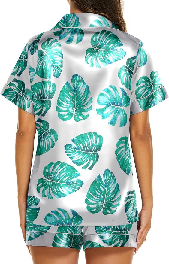 - Elegant design:Short sleeve pajama tops, button down front,notch lapel collar and one chest pocket.Matching pajama shorts for women with stretchy elastic waist that fits for any body size.Lightweight and Breathable,perfect for sleeping, lounging, or morning coffee in effortless grace