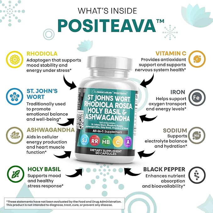 - Introducing the Positeava All In One Supplement - In addition to mood support for women and men, our formula contains Ayurveda Products and St Johns Wort Mood Health Support, and a Rhodiola Ashwagandha Complex. This can be a powerful alternative to Ashwagandha Gummies, Rhodiola Tincture, St Johns Wort Oil, St Johns Wort Tincture, and Tulsi Capsules.