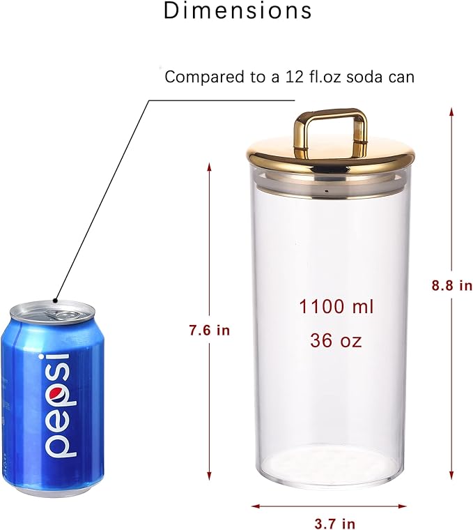 - Important Note: The capacity of the two airtight canisters is 32 ounces. Be sure to pay attention on the size of the Apothecary Jar. We've provided a detailed size chart and a comparison to a 12-ounce soda