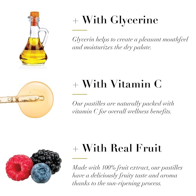 - Key Ingredient: Our pastilles moisturize the mouth thanks to the beneficial properties of glycerin, one of the most valuable components in our recipe. It leaves the palate feeling pleasant and refreshed.