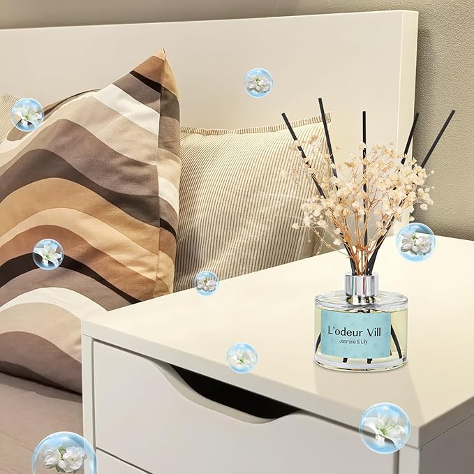 L'odeur Vill Reed Diffuser Set, 6.7 oz(200ml) Jasmine & Lily Scented Diffuser with 6 Oil Diffuser Sticks, Home Fragrance Essential Oil Reed Diffuser for Home Large Rooms Bathroom Shelf Decor