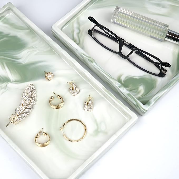 - Our bathroom vanity tray has two size for you to choose.Large size is 12*7.9*1 inches and Medium size is 11.2*6.3*1 inches.You can choose the right size to organizer your jewelry as a jewelry tray,or cosmetics as a make ups organizer,or even use it as a key tray,soap dish and a small plant tray