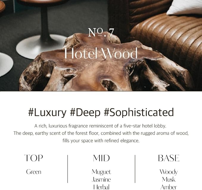- HOTEL WOOD SCENT: Experience the luxurious depth of Hotel Wood, featuring the earthy tones of rich soil and the robust essence of aged trees. This neutral yet opulent scent adds a refined touch to any space.