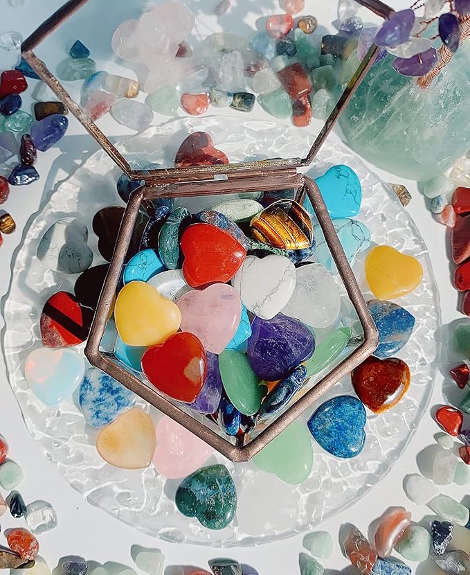 - 【 Basic Information 】50 Pcs Set (25 Colors, 2 Pieces Per Color) Mini Heart Crystal. (appro.)Size : 0.8*0.8*0.24"; Opal,Rose Quartz,Amethyst,Tiger Eye,Black Obsidian,Green Aventurine,Clear Quartz,Cherry Quartz,Dragon Bloodstone,Red Carnelian,Purple Agate,Lilac Amethyst,White Howlite,Grey Labradorite,Red Jasper,Black Line Rhodolite,Blue Aventurine,Blue Sodalite,Unakite,Black Spectrolite Stone,Dalmatian Stone,Snow Turquoise,Yellow Aventurine,Topaz,Red Turquoise.