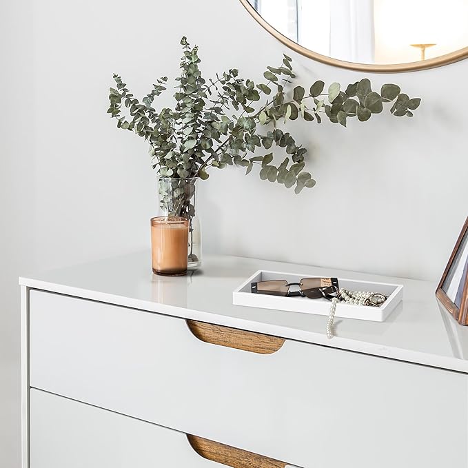 - 【Multifunctional/Multipurpose】Our bathroom vanity tray can be used for multiple purposes, mainly for dresser, counter, bathroom, bedroom, kitchen, desk, toilet tank top,etc. Kitchen soap tray can organizer small items, such as perfume, candle, jewelry, Trinket, Ring, watch, key, soap, soap dispenser.