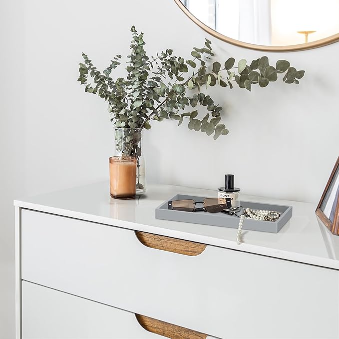 - 【Multifunctional/Multipurpose】Our bathroom vanity tray can be used for multiple purposes, mainly for dresser, counter, bathroom, bedroom, kitchen, desk, toilet tank top,etc. Kitchen soap tray can organizer small items, such as perfume, candle, jewelry, Trinket, Ring, watch, key, soap, soap dispenser.