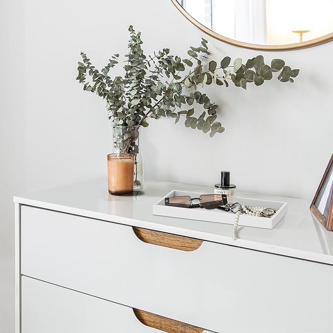 - 【Multifunctional/Multipurpose】Our bathroom vanity tray can be used for multiple purposes, mainly for dresser, counter, bathroom, bedroom, kitchen, desk, toilet tank top,etc. Kitchen soap tray can organizer small items, such as perfume, candle, jewelry, Trinket, Ring, watch, key, soap, soap dispenser.