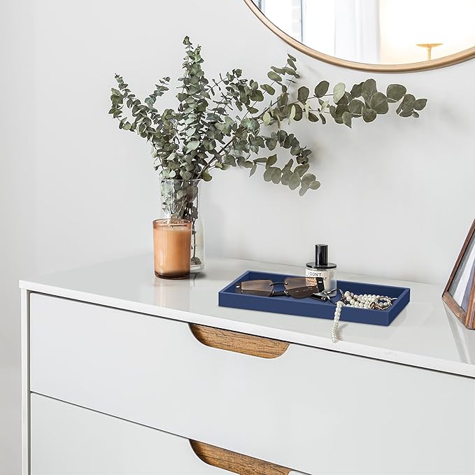 - 【Multifunctional/Multipurpose】Our bathroom vanity tray can be used for multiple purposes, mainly for dresser, counter, bathroom, bedroom, kitchen, desk, toilet tank top,etc. Kitchen soap tray can organizer small items, such as perfume, candle, jewelry, Trinket, Ring, watch, key, soap, soap dispenser.