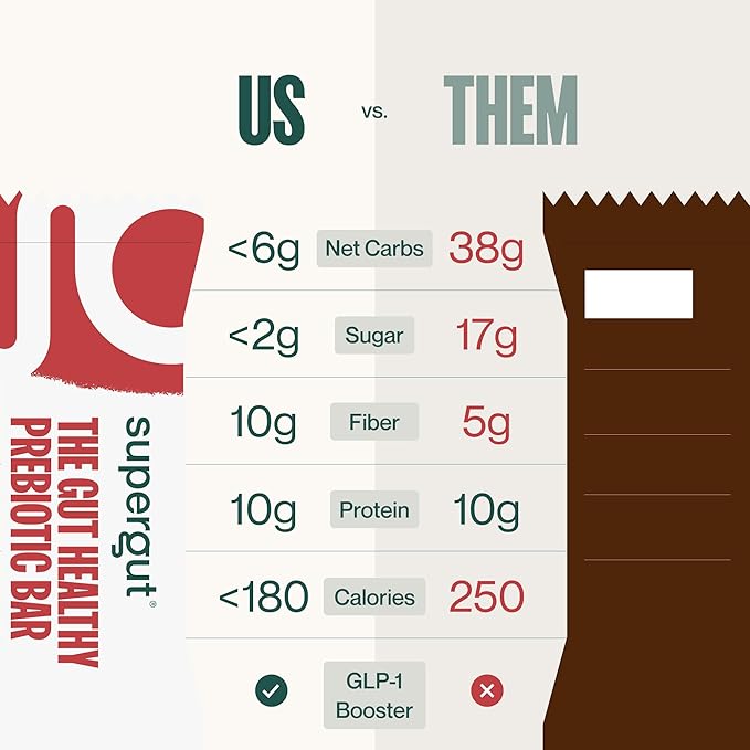 - Packed with Nutrition: Kick hunger to the curb with Supergut’s Gut Healthy Prebiotic bar, an on-the-go snack that helps curb cravings. Each bar contains 10 grams of prebiotic fiber, 10 grams of protein at under 6 grams of net carbs and less than 2 grams of sugar. Strawberry Almond flavor.