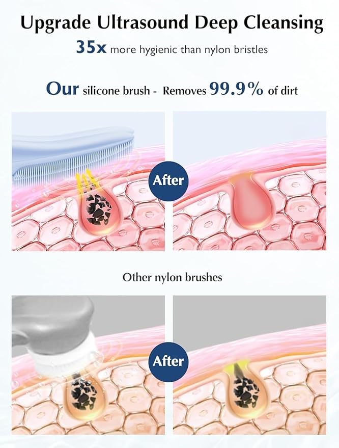 - 35 DAYS SUPER BATTERY LIFE: Silicone face scrubber has a built-in 500mAh large-capacity battery, which only takes 2 hours to fully charge and can be used continuously for more than 35 days. The gentle facial cleansing brush comes with a storage box and storage bag, making it easy to store at home or travel, so you can enjoy spa-grade facial treatments at any time