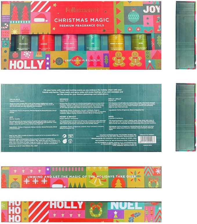 Folkulture Christmas Fragrance Oils for Diffuser as Gifts | Set of 6 Christmas Essential Oils Set for Diffusers for Home | Peppermint, Candy, Apple Tart, Cranberry, Vanilla (Christmas Magic)