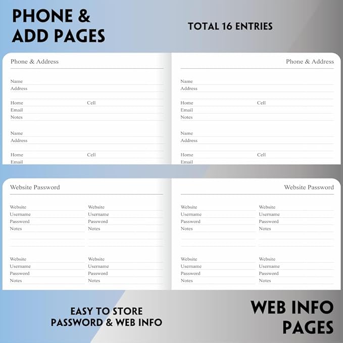 - Major holidays listed, yearly goals, important date pages, website password, address and expense pages, and 9 notes pages