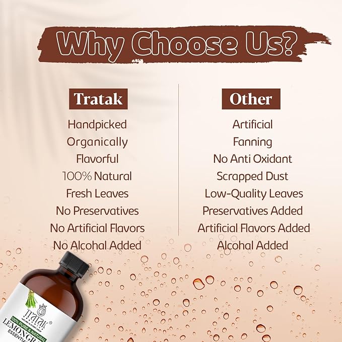 - BOTTLED WITH CARE: Tratak lemongrass is housed in dark amber glass bottles with a built-in dropper for easy and precise dispensing, allowing you to control the amount to be used. The lemongrass is packed with full care to protect their integrity and potency, preserving their freshness and extending its shelf life.