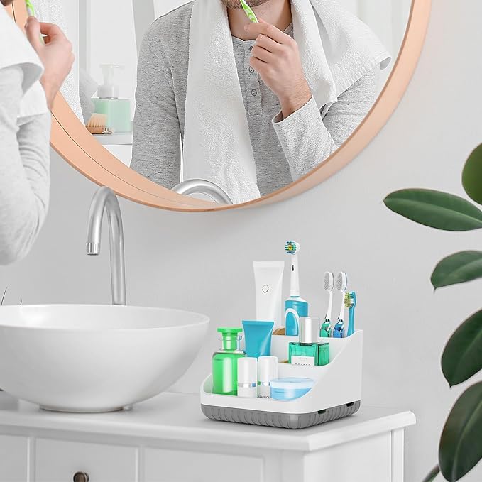 - Save 80% Space: The tooth brushing holder has been divided into 6 areas according to the dividers which can easily to store items you need in a place, like toothbrushes, toothpaste, mouthwash, facial cleanser, dental flosser, razor, shaver, comb and other bathroom accessories