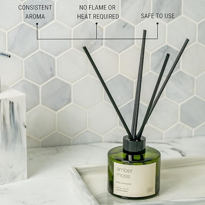 Craft & Kin Amber Moss Reed Diffuser | All Natural Essential Oil & Rattan Scent Sticks | Fall Reed Diffusers for Home, Bathroom | Long Lasting Home Fragrance in Green Glass, 3.4oz