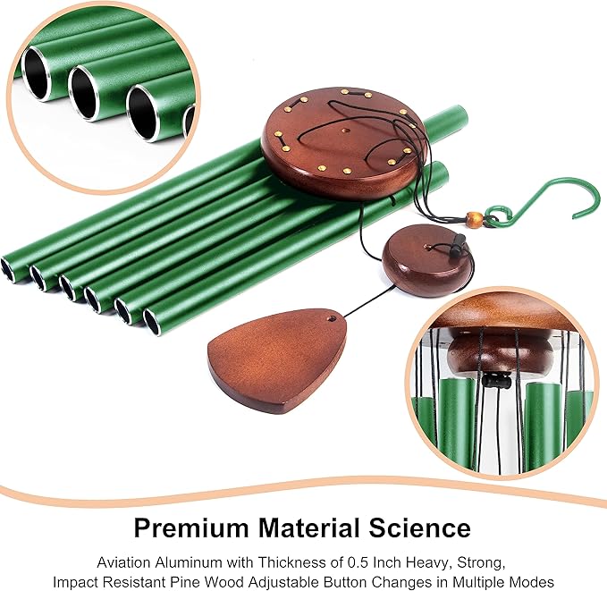 - šµ[Large Wind Chimes Size]: The windchime is made of premium aluminum pipe and pine. The total length of the wind chimes from the top's S-shaped hook to the bottom's catcher is 37" Among them, 6 classic green anodized aluminum tubes have excellent corrosion resistance and wear resistance, and the length ranges from 8.7" to 12.6". The wood is made of wear-resistant and non-cracking pine