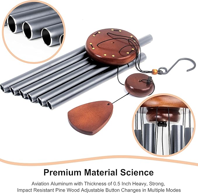 - šµ[Large Wind Chimes Size]: The windchime is made of premium aluminum pipe and pine. The total length of the wind chimes from the top's S-shaped hook to the bottom's catcher is 37" Among them, 6 classic blue gray anodized aluminum tubes have excellent corrosion resistance and wear resistance, and the length ranges from 8.7" to 12.6". The wood is made of wear-resistant and non-cracking pine.