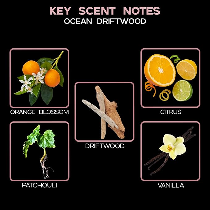 - OCEAN DRIFTWOOD – evokes a fresh coastal escape with Citrus, Orange Blossom, Cottonwood, Driftwood, Patchouli, and Vanilla; showcased in our Modern Striped Diffuser, a sleek frosted glass bottle etched with clean vertical stripes for a minimalist yet eye-catching look, topped with a slender neck and delicate navy blue ribbon accent for a refined, timeless look, and enhanced with natural seashells; pairs beautifully with deep blue, indigo, and coastal interiors