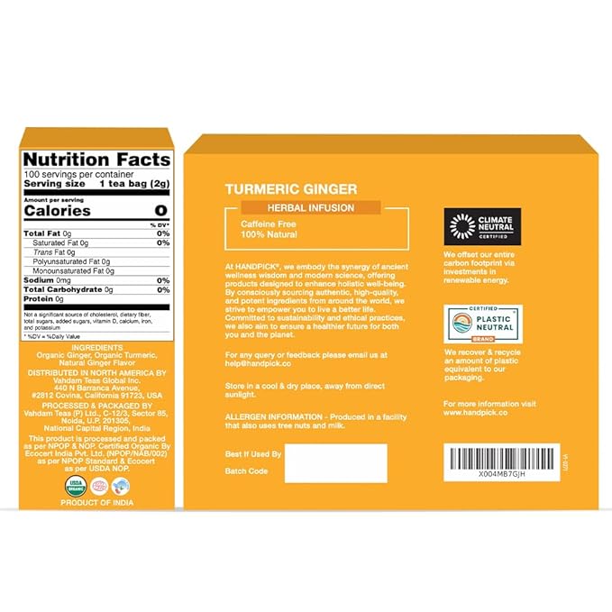 HANDPICK, Organic Turmeric Ginger Tea (100 Tea Bags) | Authentic Indian Origin | Caffeine Free, Gluten Free, Non-GMO | 100% Pure Herbal Blend - Savory & Spicy I Ecofriendly round tea bags