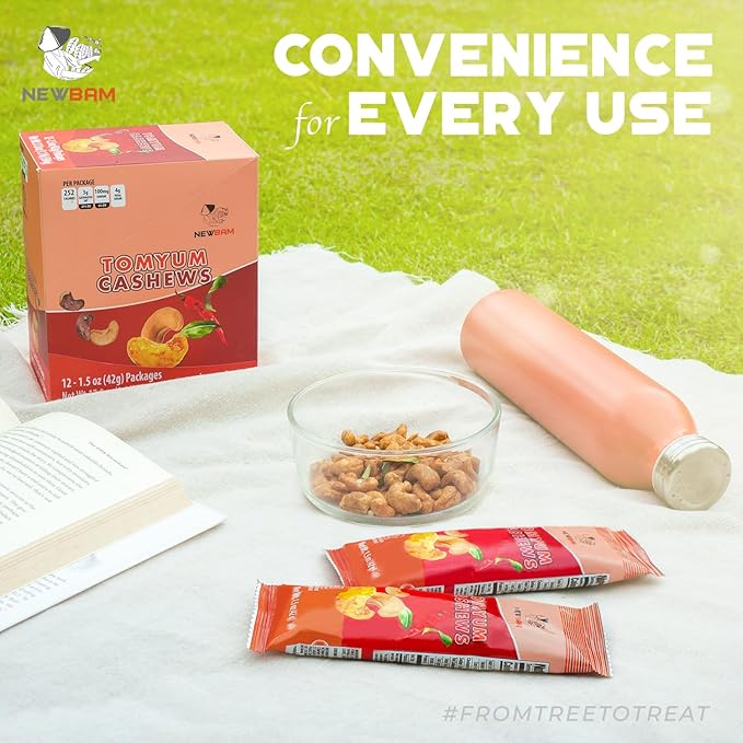 NEWBAM Spicy Tom Yum Cashews Individual Packs - 12 Cashew Snack Packs Roasted Nuts (1.5oz Each) – Authentic Thai Flavor, Keto, Vegan, Gluten-Free - Healthy Snacks for Trail Mix, Office, or Party - Low Sugar