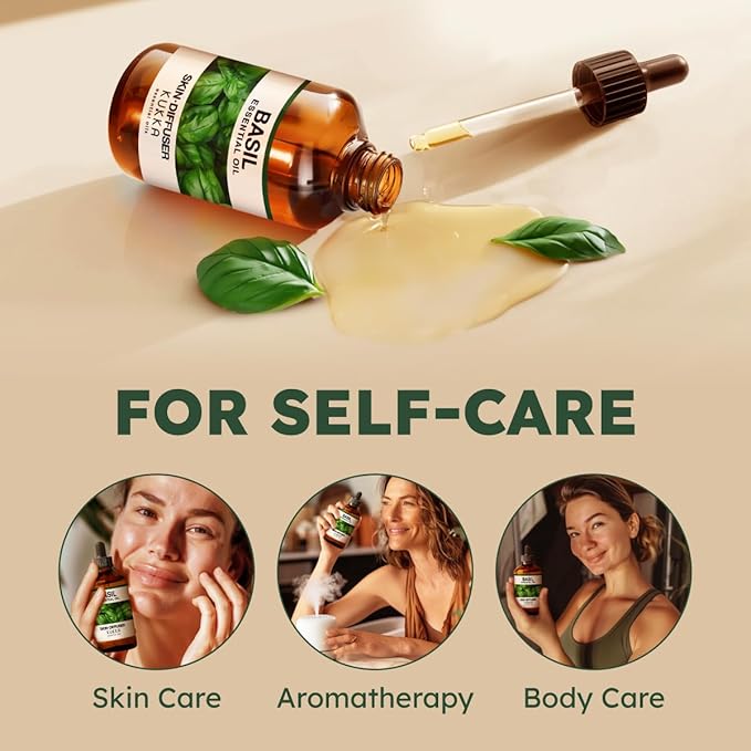 - Nurtures dull-looking skin. Basil essential oil for skin has potential benefits to gently nurture and hydrate skin. Suits all skin types, add basil oil for skin to your skincare routine by mixing a few drops with moisturizer or carrier oil.