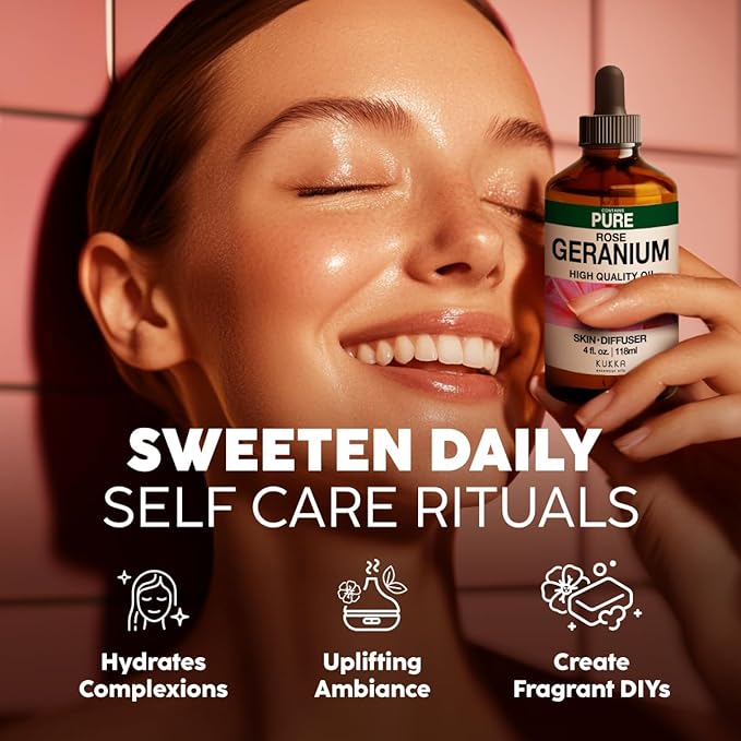 - Perfect for aromatherapy & body use. A popular favorite for its sweet and floral scent, our rose geranium essential oil can be used in various ways — diffusion, skincare, massages and more. Add it to water, carrier oil or lotion to enjoy its aroma.