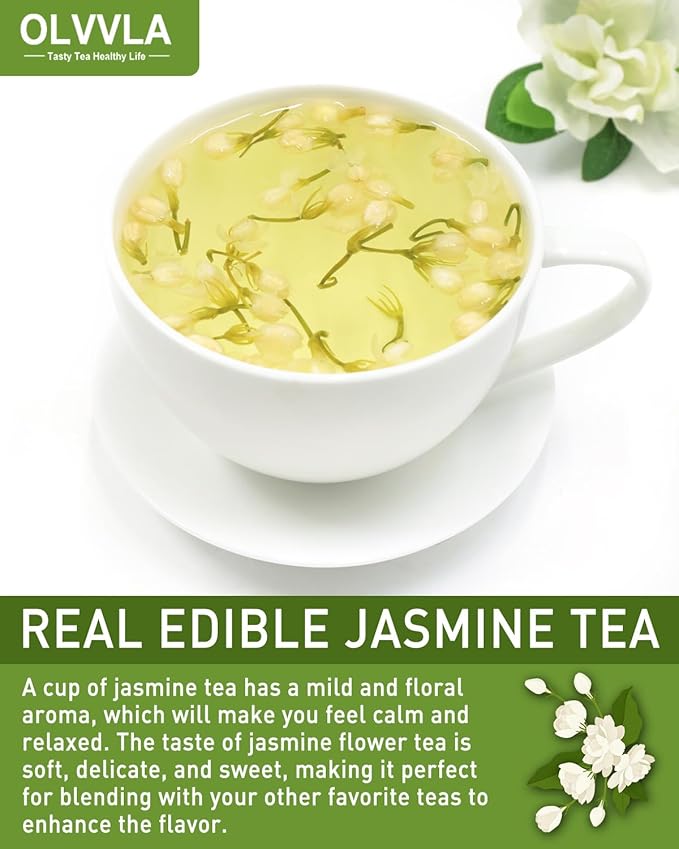 - REAL JASMINE TEA: A cup of jasmine tea has a mild and floral aroma, which will make you feel calm and relaxed. The taste of jasmine flower tea is soft, delicate, and sweet, making it perfect for blending with your other favorite teas to enhance the flavor;