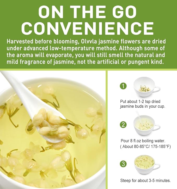 - NATURAL AROMA: Harvested before blooming, Olvvla jasmine flowers are dried under advanced low-temperature method. Although some of the aroma will evaporate, you will still smell the natural and mild fragrance of jasmine, without pungent flavor;
